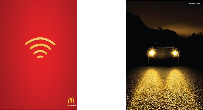 “McDonald’s-da pulsuz vayfay” və “24/7 McDrive xidməti” posterləri. Birinci posterdə fri-kartoflardan düzülmüş vayfay simvolu kreativin açarıdır. İkincisində isə avtomobilin işıqları yerə brendin tanınmış "M" hərfinin əksini salır.