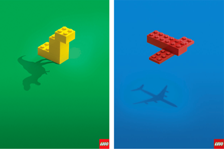 “Lego”nun posterlərində loqodan başqa heç bir yazı yoxdur. Sadəcə “Lego” kərpicləri ilə düzəldilmiş fiqurların kölgəsində dinozavr və təyyarənin təsvirini görürük. “Lego” fiqur çeşidinin müxtəlifliyi ilə uşaq təxəyyülünə uyğun istənilən modelin yığılmasının mümkünlüyünü vurğulayır.