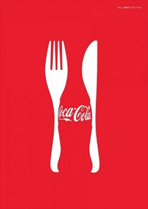 Aşağıdakı posterdə çəngəl və bıçaq elə təsvir edilib ki, onların bir araya gəlməsindən “Coca-Cola” butulkasının forması yaranır. Ötürülən ismarış isə çox ehtimal ki, budur: “Yemək vaxtı yalnız kola!”