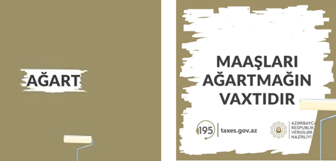 Azərbaycan Respublikasının Vergilər Nazirliyi üçün “Maxmedia” komandasının hazırladığı “Maaşları ağartmağın vaxtıdır!” çöl reklamına da tizer şəklində müqəddimə verilib. Sonradan aşkara çıxacaq əsas ismarışın yekrəng sahədə təkcə AĞART sözü göstərilib. Bir neçə həftədən sonra isə “Maaşları ağartmağın vaxtıdır!” çağırışı tam olaraq sərgilənib.